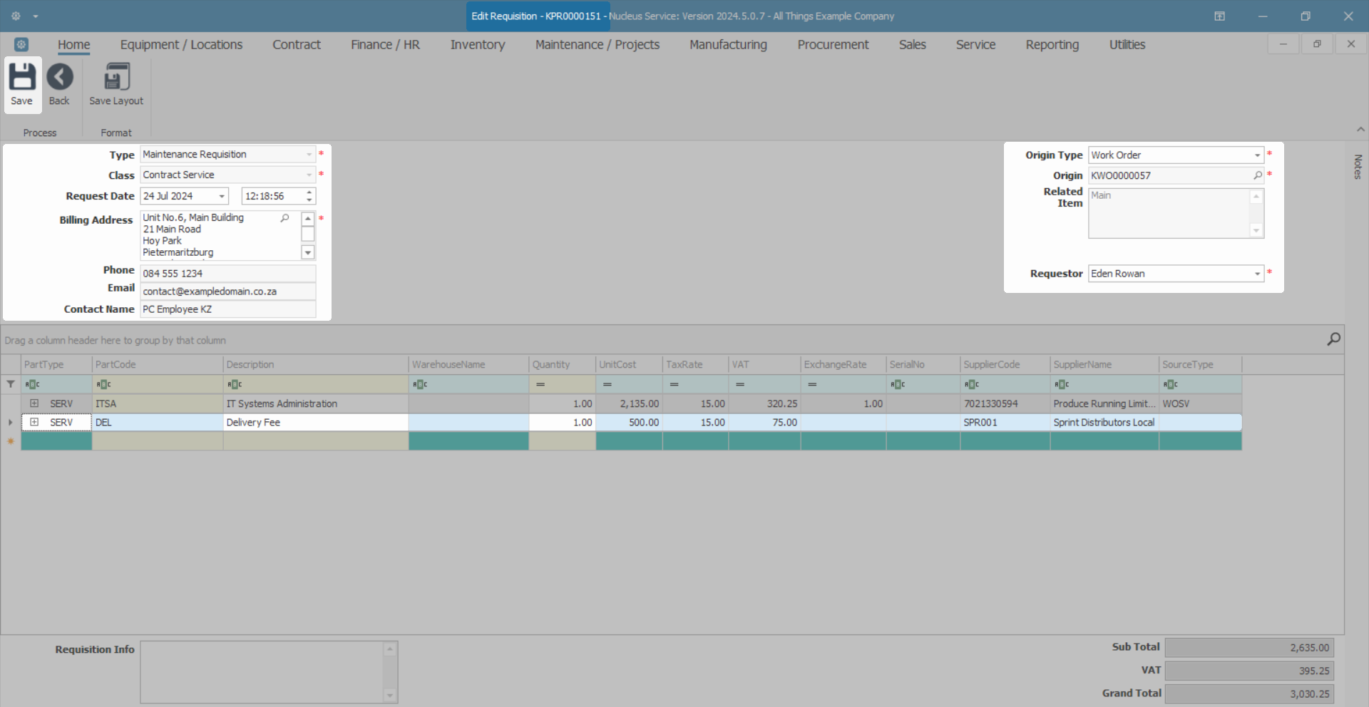 - Complete the Part or Service Requisition and then click on Save.