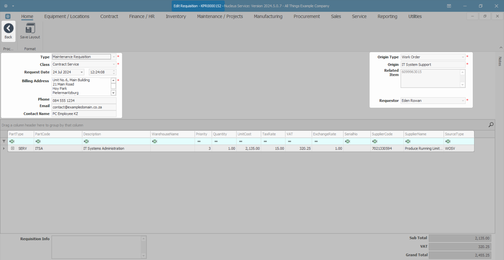 For details on completing the Service Requisition refer to Service Requests - Add Service Request