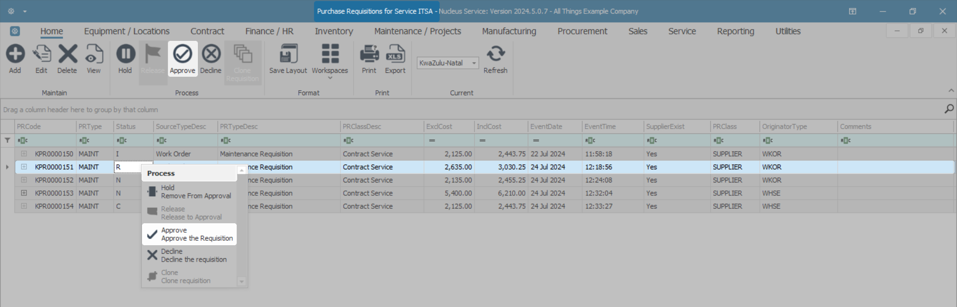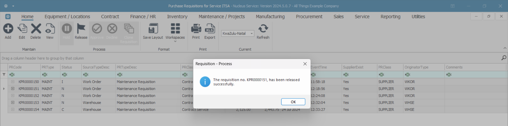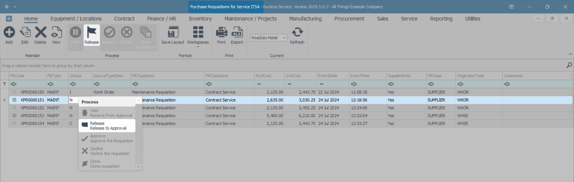 A Purchase Requisition can only be released for approval when the total value is more than R0, the items have a quantity greater than 0, and all parts have a supplier cost linked.
