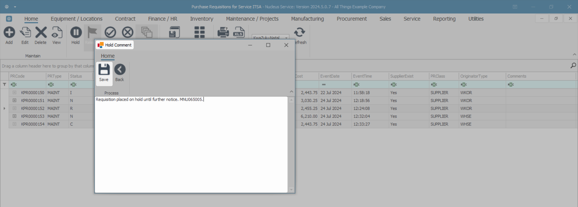 - Click in the text area to type a comment or reason for placing the requisition on hold.