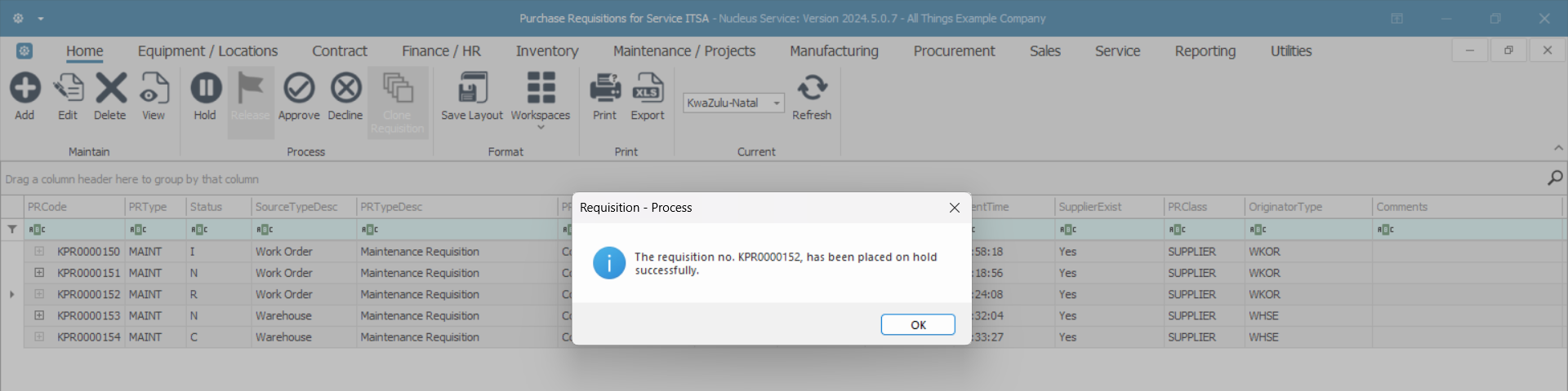 - The requisition no. [ ], has been placed on hold successfully.