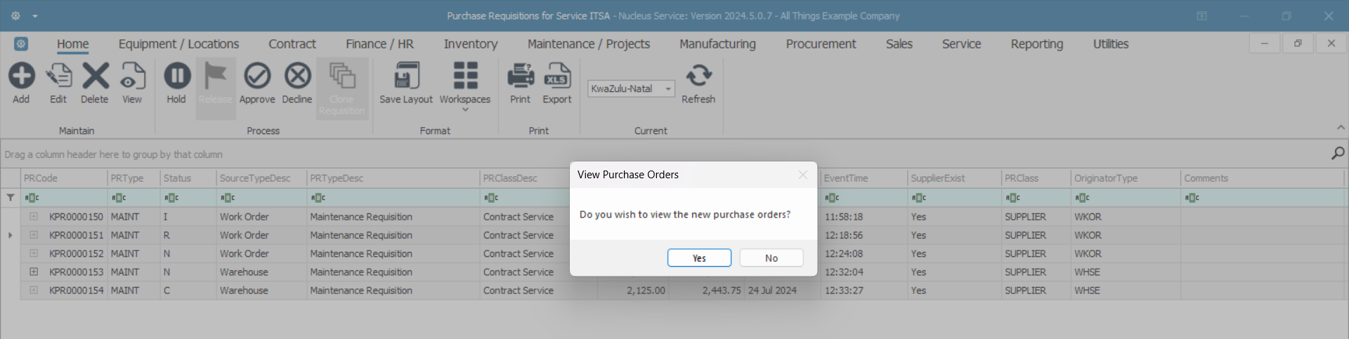 - Click on No if you want to remain in the Purchase Requisition listing screen.