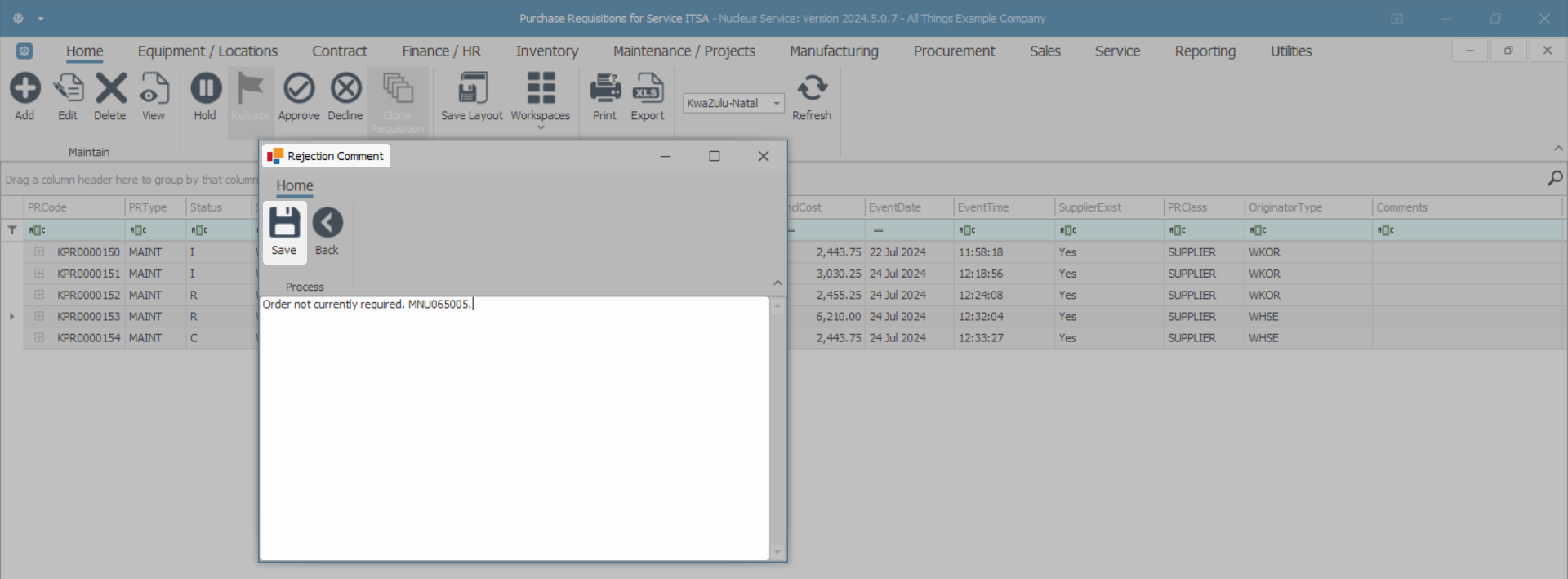 - Click in the text area to type a comment or reason for declining the requisition.