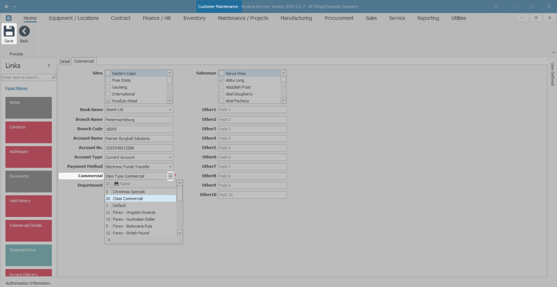 - Click on the Commercial tab to display the commercial details for the Customer.