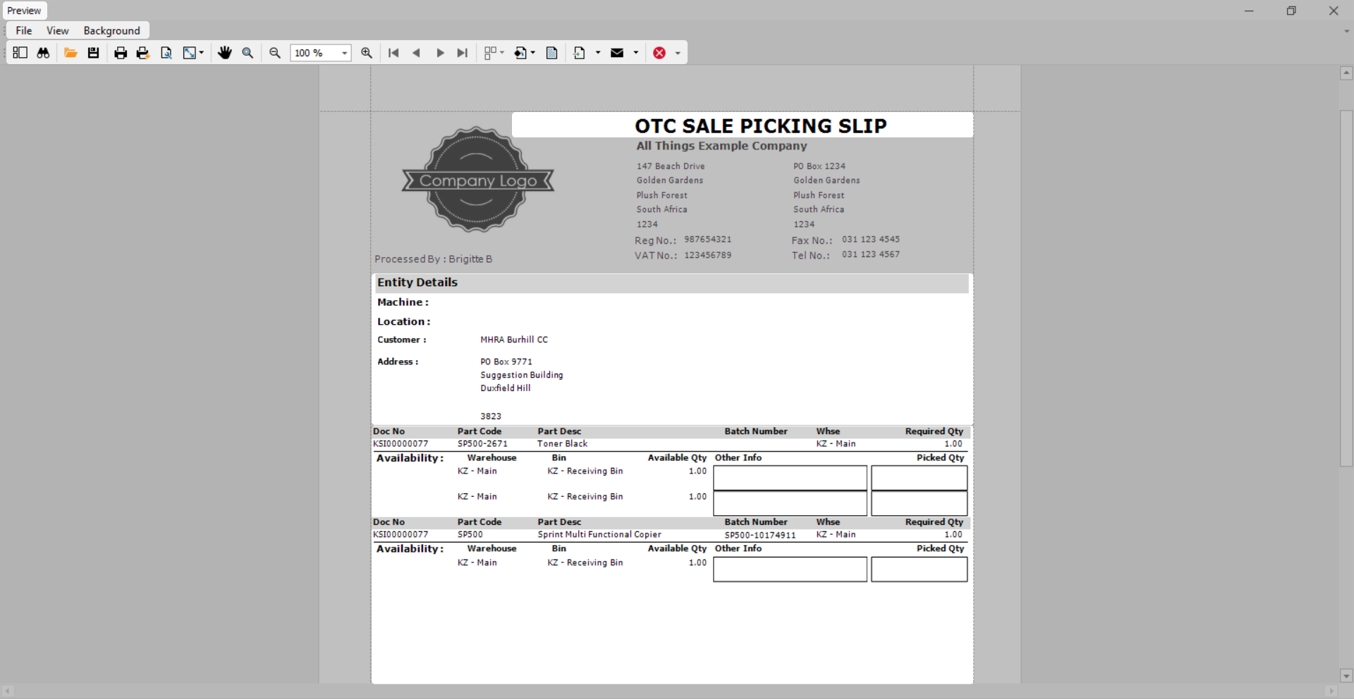 A report layout has been provided for the Picking Slip to be printable from the POS Lite screen, which is inserted into the Custom Layout table. The value for the OTC Sales Picking Slip Template config flag is set to the description of the report layout.