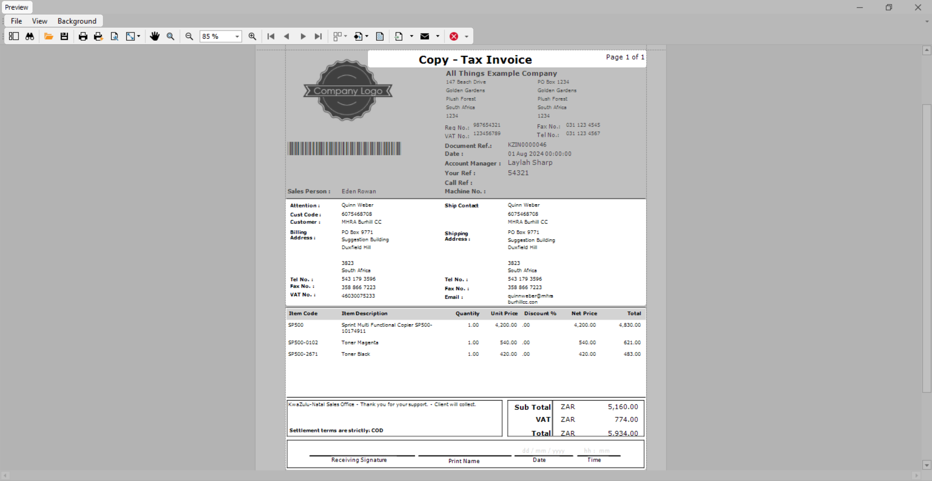Note that when you print the Invoice for the first time, it will display Tax Invoice. The next time you print the Invoice, it will display Copy - Tax Invoice. - From the preview screen you can make cosmetic changes to the document as well as Save, Zoom, Add a Watermark, Export or Email the Tax Invoice.