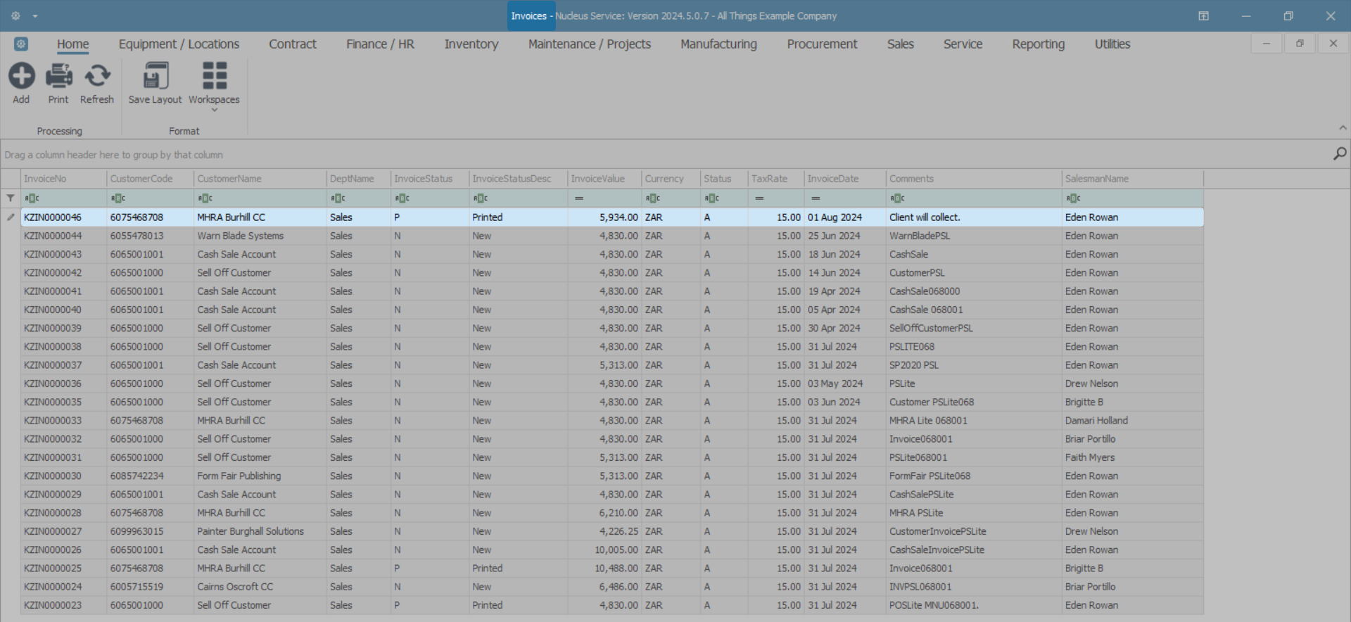 Once the invoice is printed, the transaction is posted to the company financial system, (e.g. Nucleus Service Accounts), and the status will change to Printed (P).