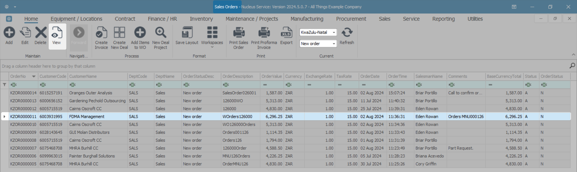 - The example has KwaZulu-Natal as the site and New Order as the status selected.