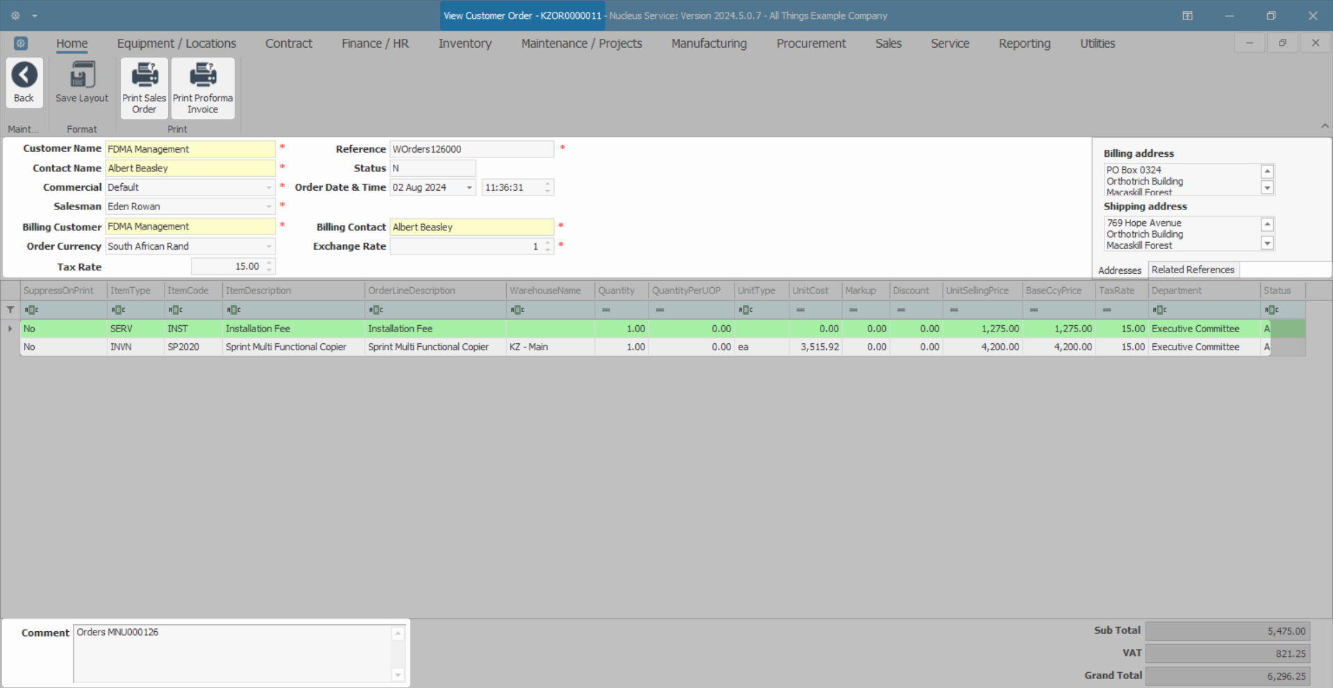 This is a View only screen and you will not be able to make changes to any of the customer details, billing details, related references or the item details for this sales order. - You can however Print a Sales Order or Print, Email a Proforma Invoice from this screen.