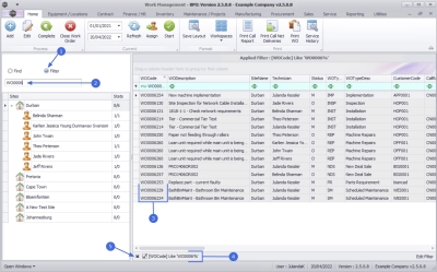 Use the filter function to list a range of Open or Completed Work Orders, containing the prefix you have typed in.