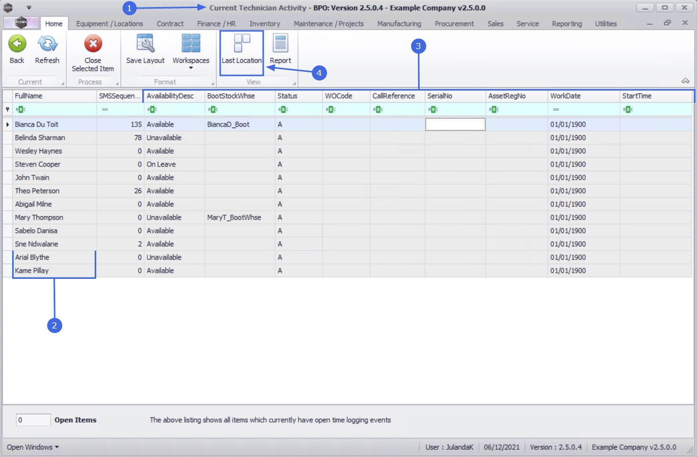 - Which Work Order, Call, Serial Number and / or Asset Register Number each technician is currently linked to, and