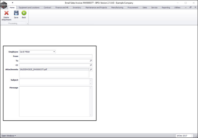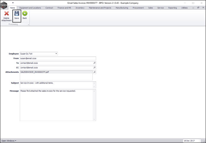 - Attachments: The sales invoice PDF will be attached to the email. If there are outstanding parts that have not been issued, a Back Order report will also be attached. You can link additional attachments by clicking on the search button and using the Select File screen to select a file to attach.