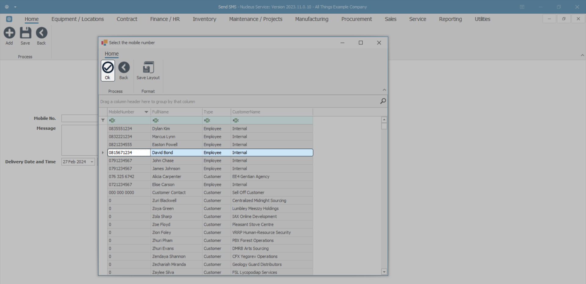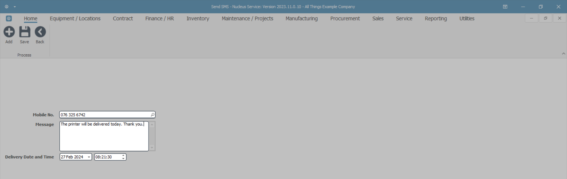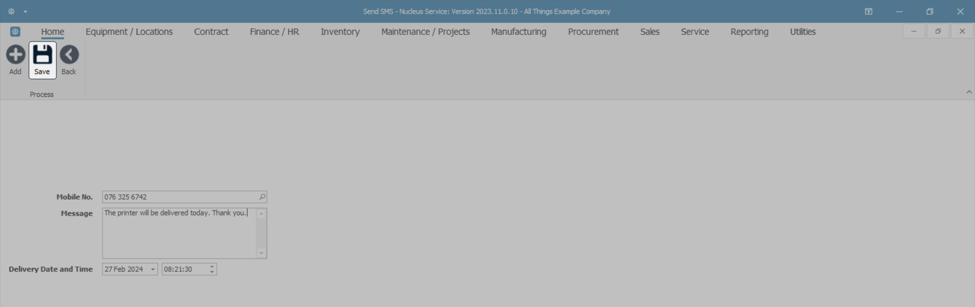 This functionality requires a bulk SMS gateway API from a relevant external provider to extract the data from our SMS table. You can send SMSs to your customer contacts and employees in Nucleus Service.