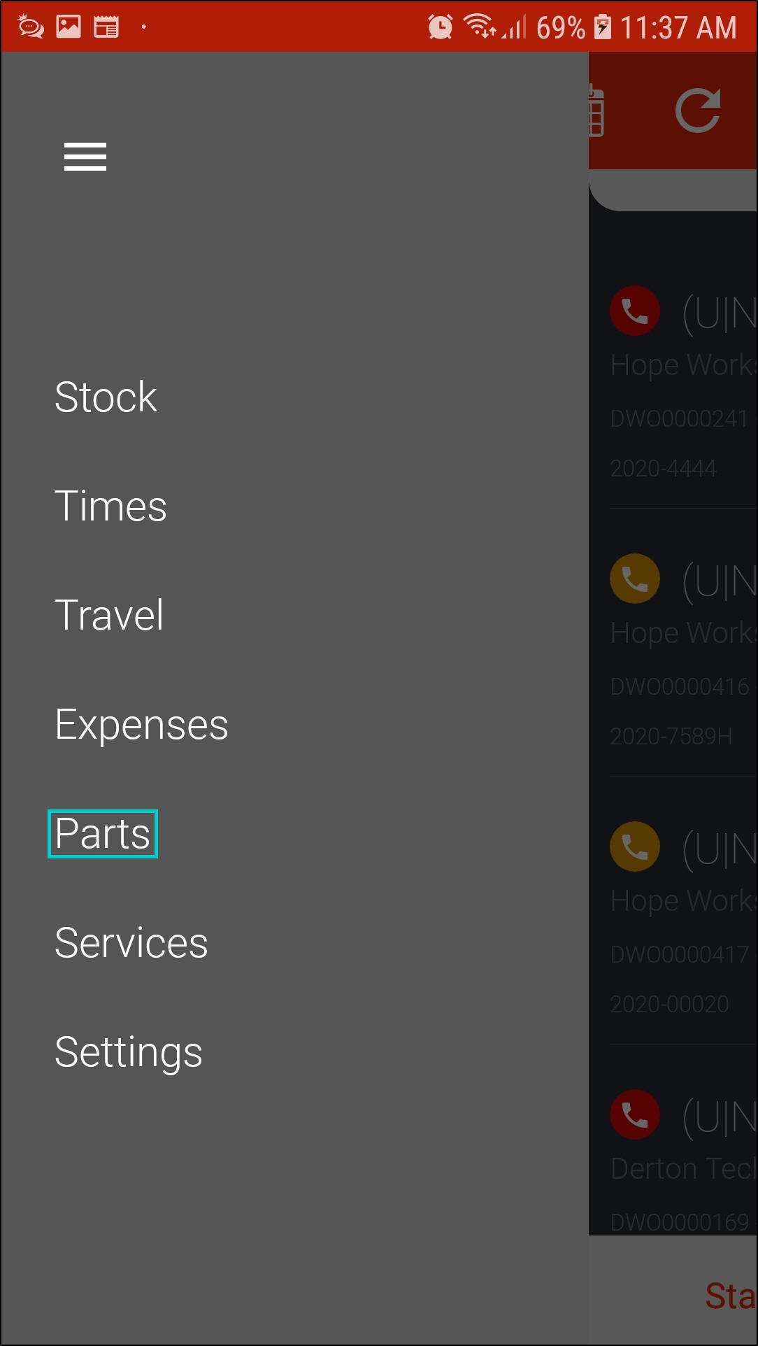 - The Parts List screen will be displayed.