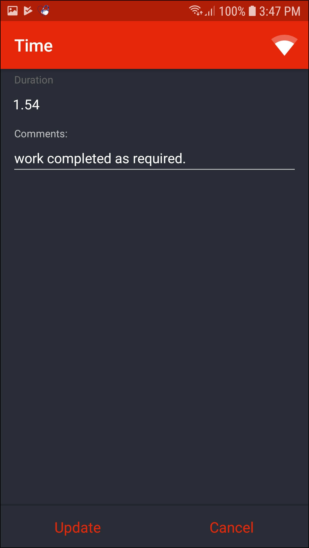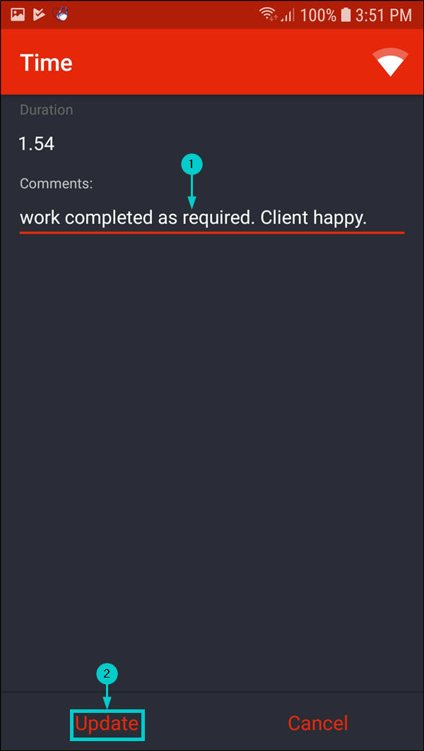 - From this screen, you can view the time duration and comments related to the selected time record.