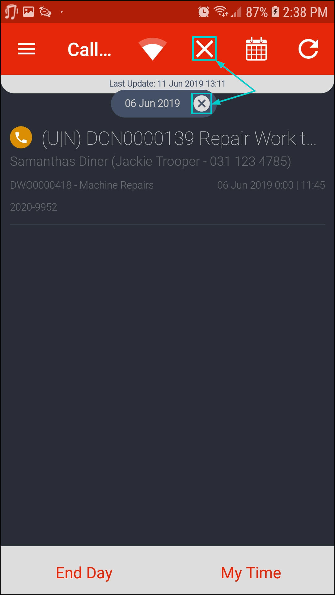 - To remove the filter, click on the (X) button in either the Filter Calls by Date section or the Calls List screen.