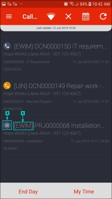 - Action buttons will be displayed at the bottom of the screen, they will vary according to the status of the call / project selected;