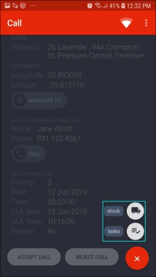- Start Travel Status: On Site | Reject Call buttons will be displayed.