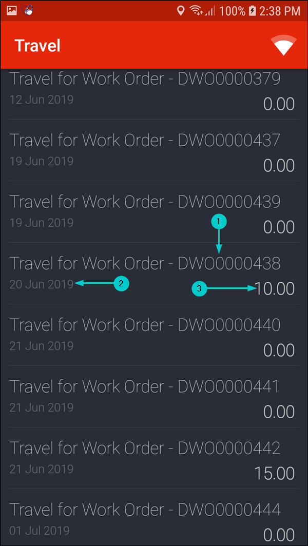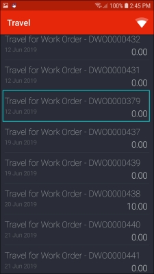 - A list of travel records for all your work orders will be displayed in this screen showing the;