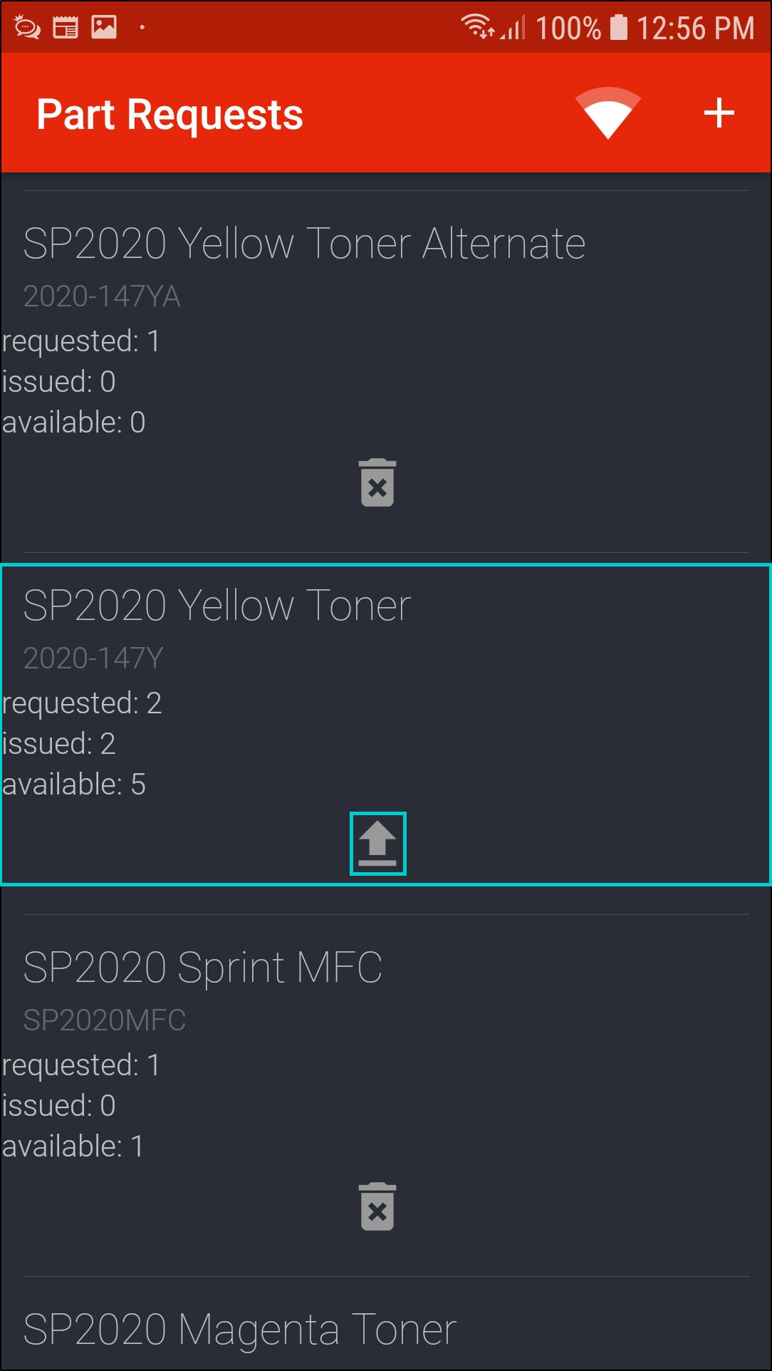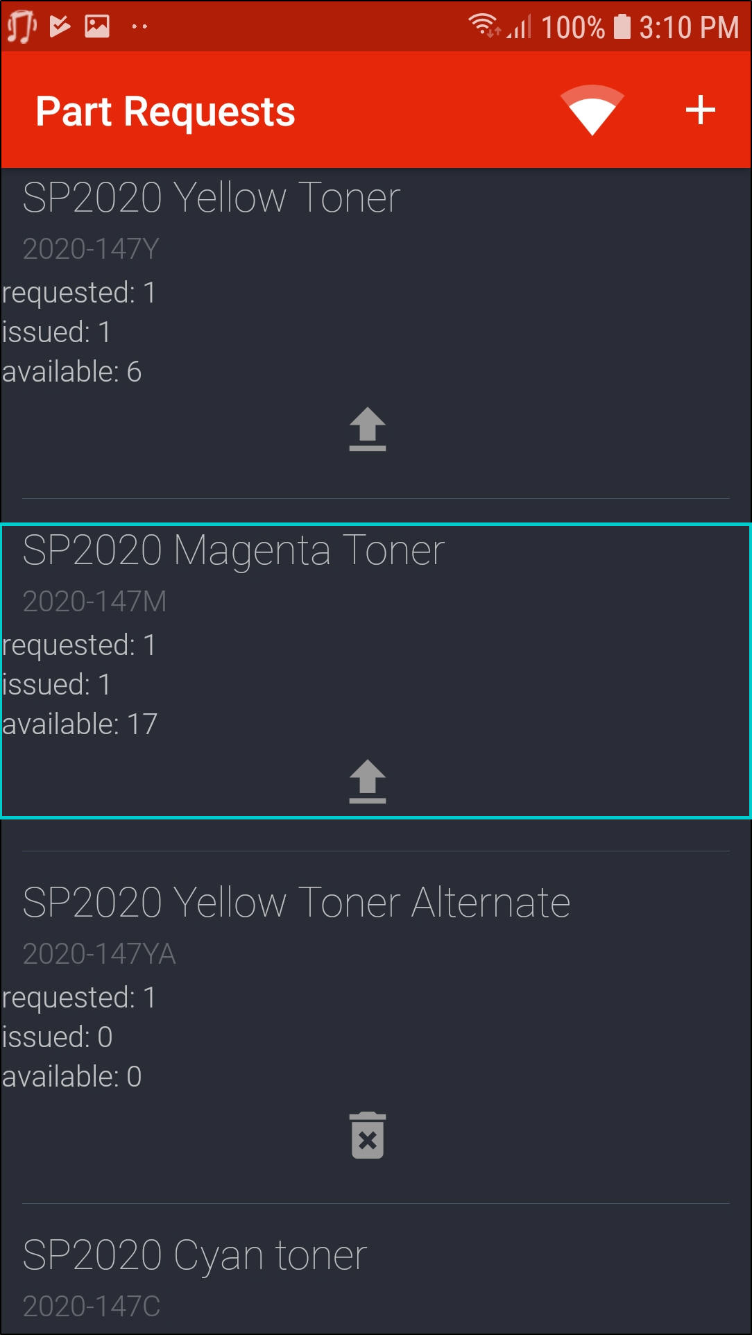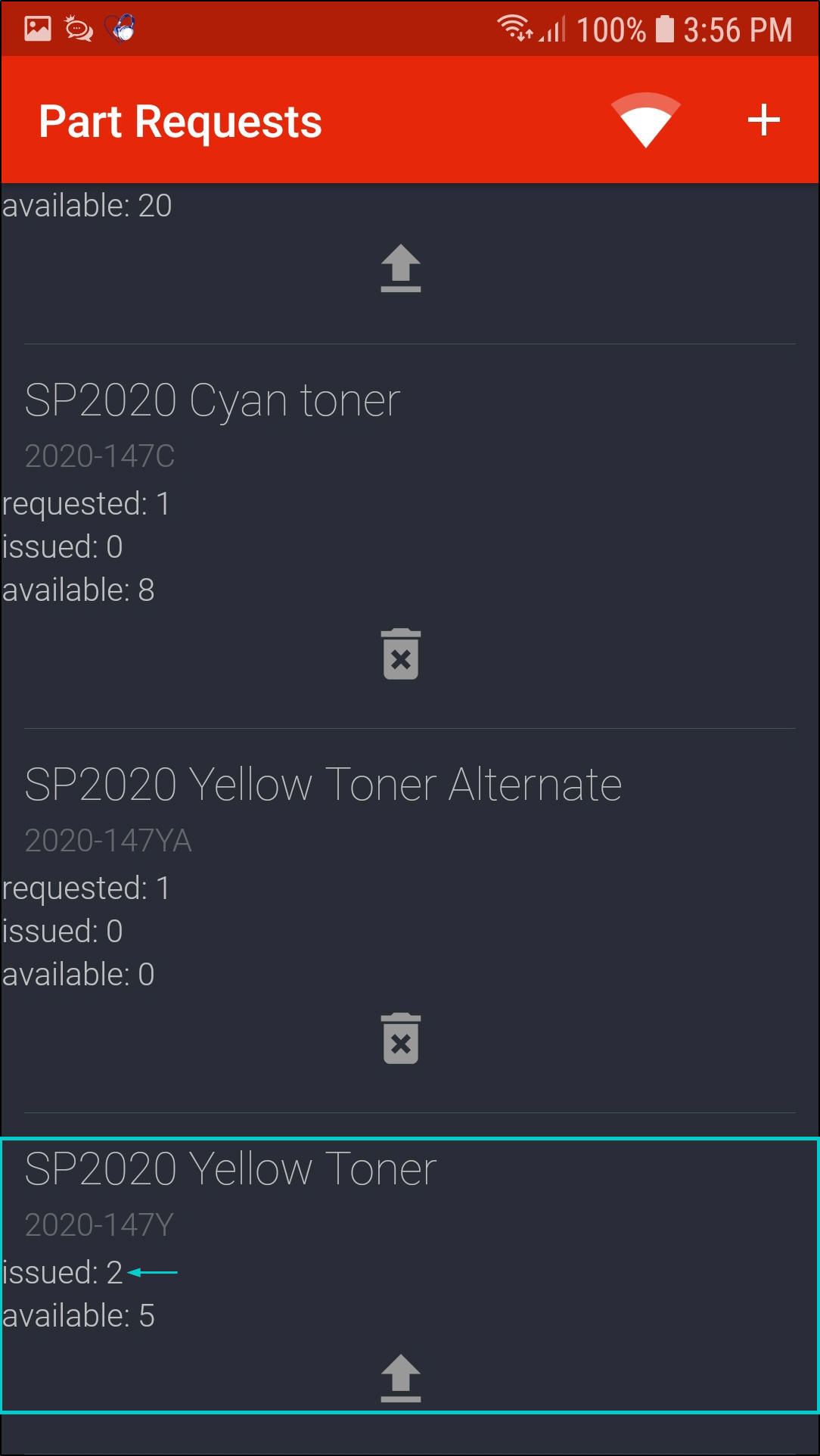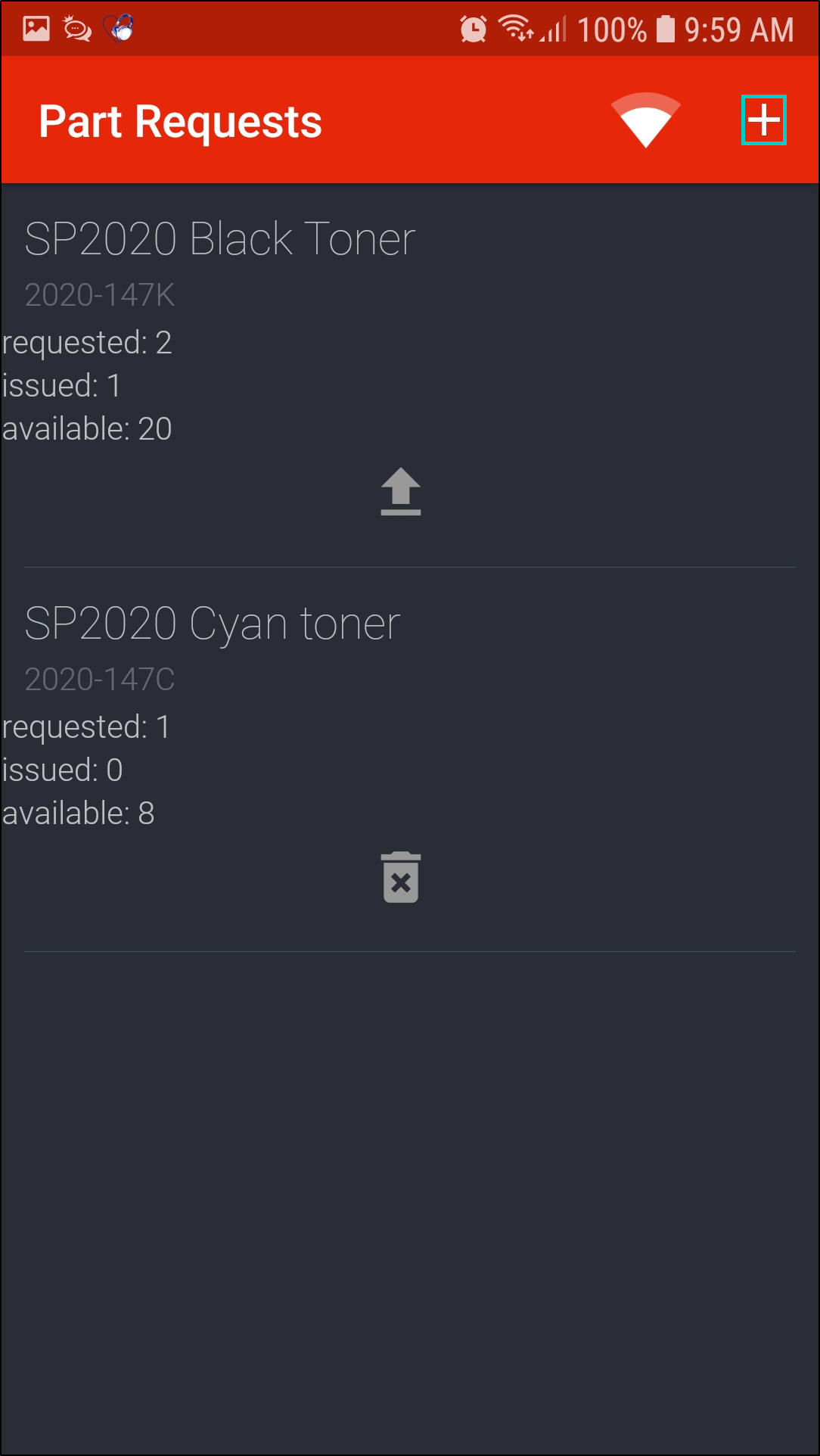 - To add a part request, click on the '+' icon in the Part Requests screen.