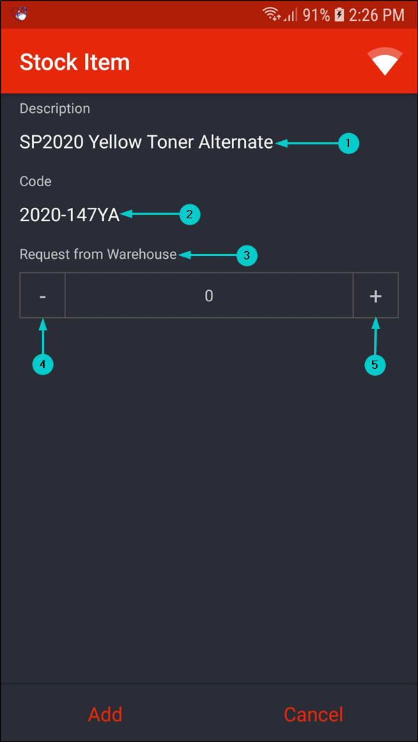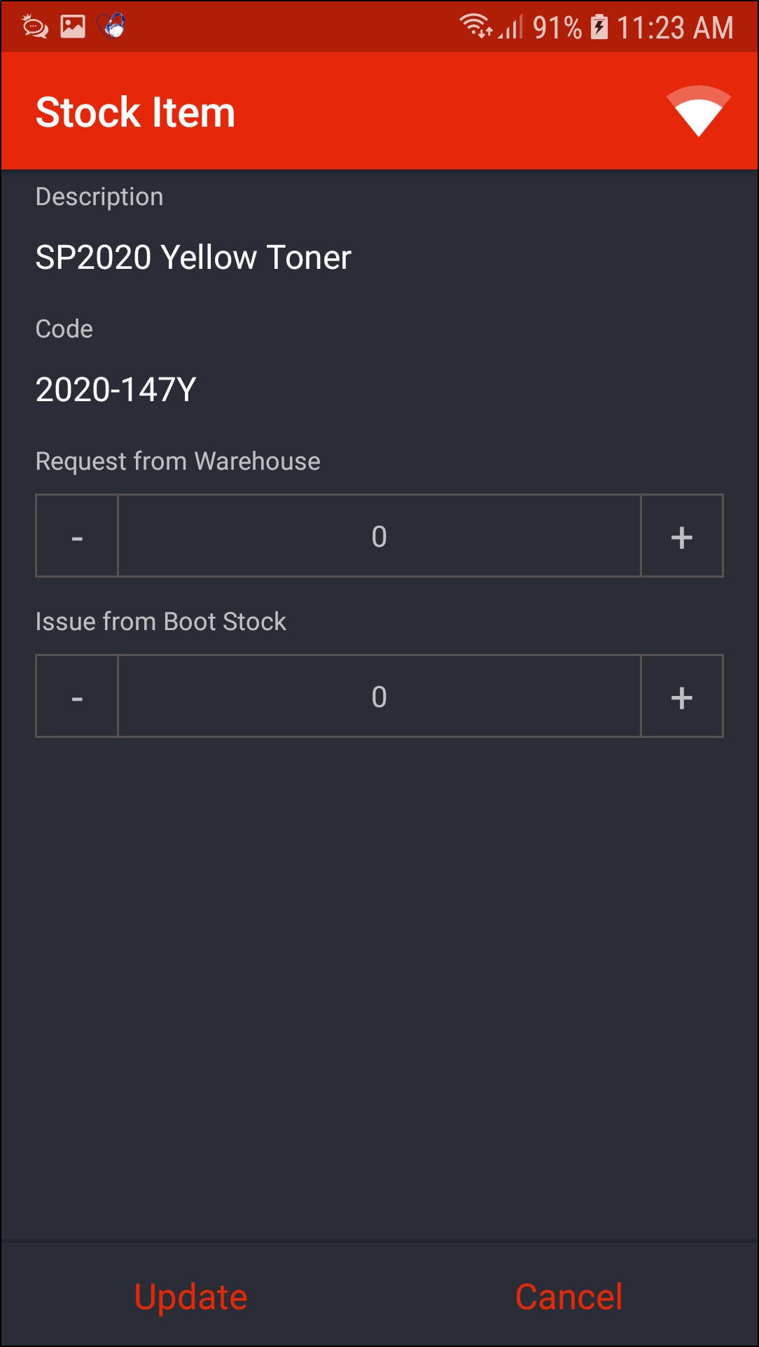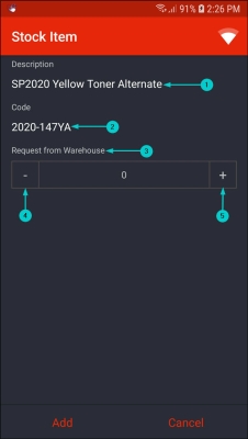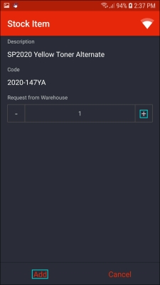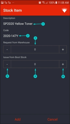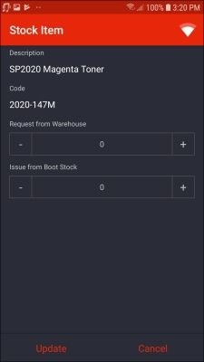 - In this screen, you can either request stock from the 'main' warehouse or from your boot stock warehouse.
