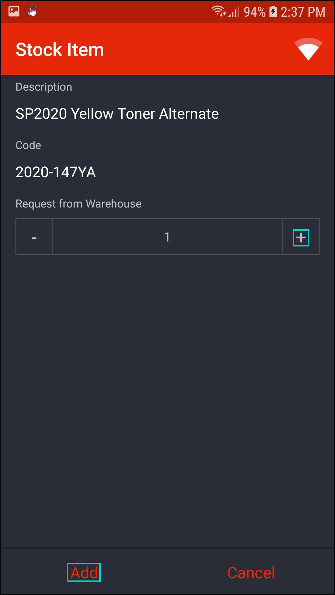 - In the Request from Warehouse field, click on the '+' icon to add the required quantity.