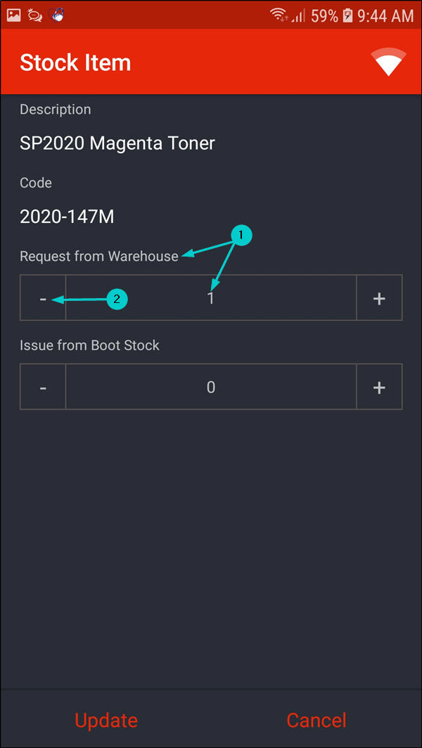 - In the Request from Warehouse field, use the '-' sign to remove the same quantity from the 'main' warehouse you wish to issue from your boot stock warehouse.