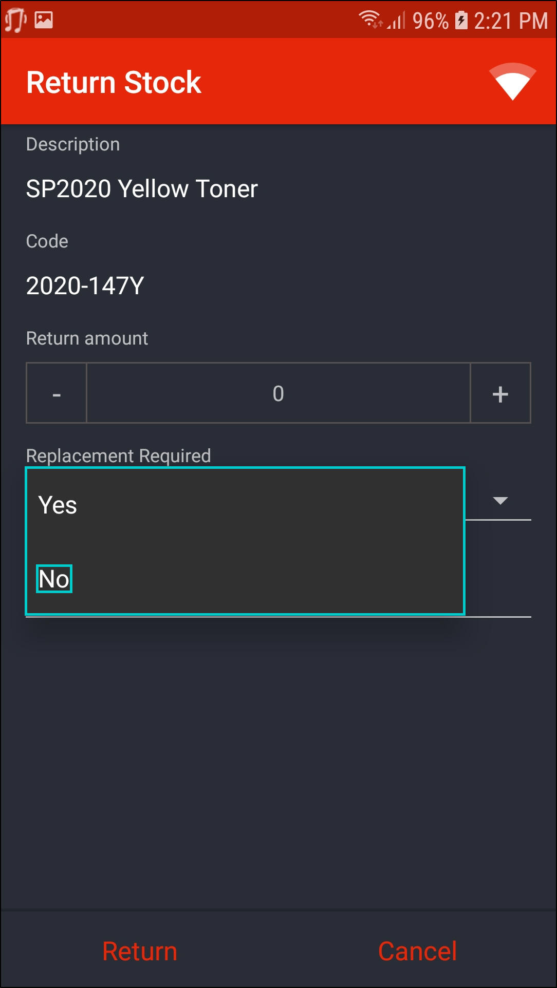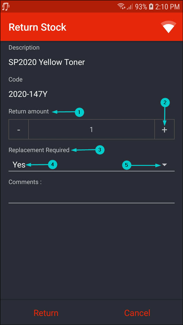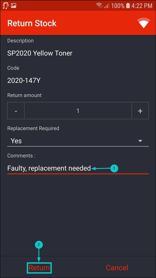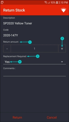 - The Return Stock screen will be displayed.
