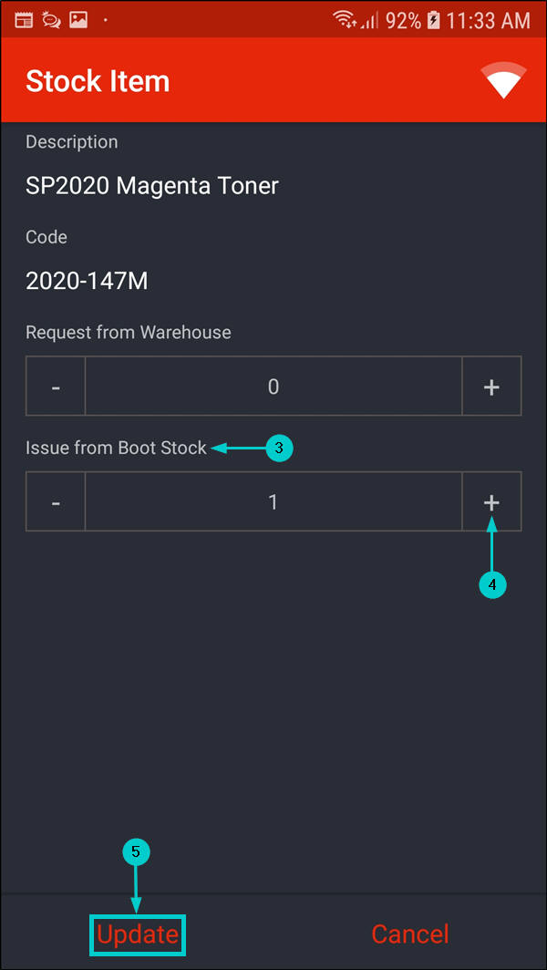 - Request Additional Stock: This enables you to request additional stock from the boot stock / 'main' warehouse.