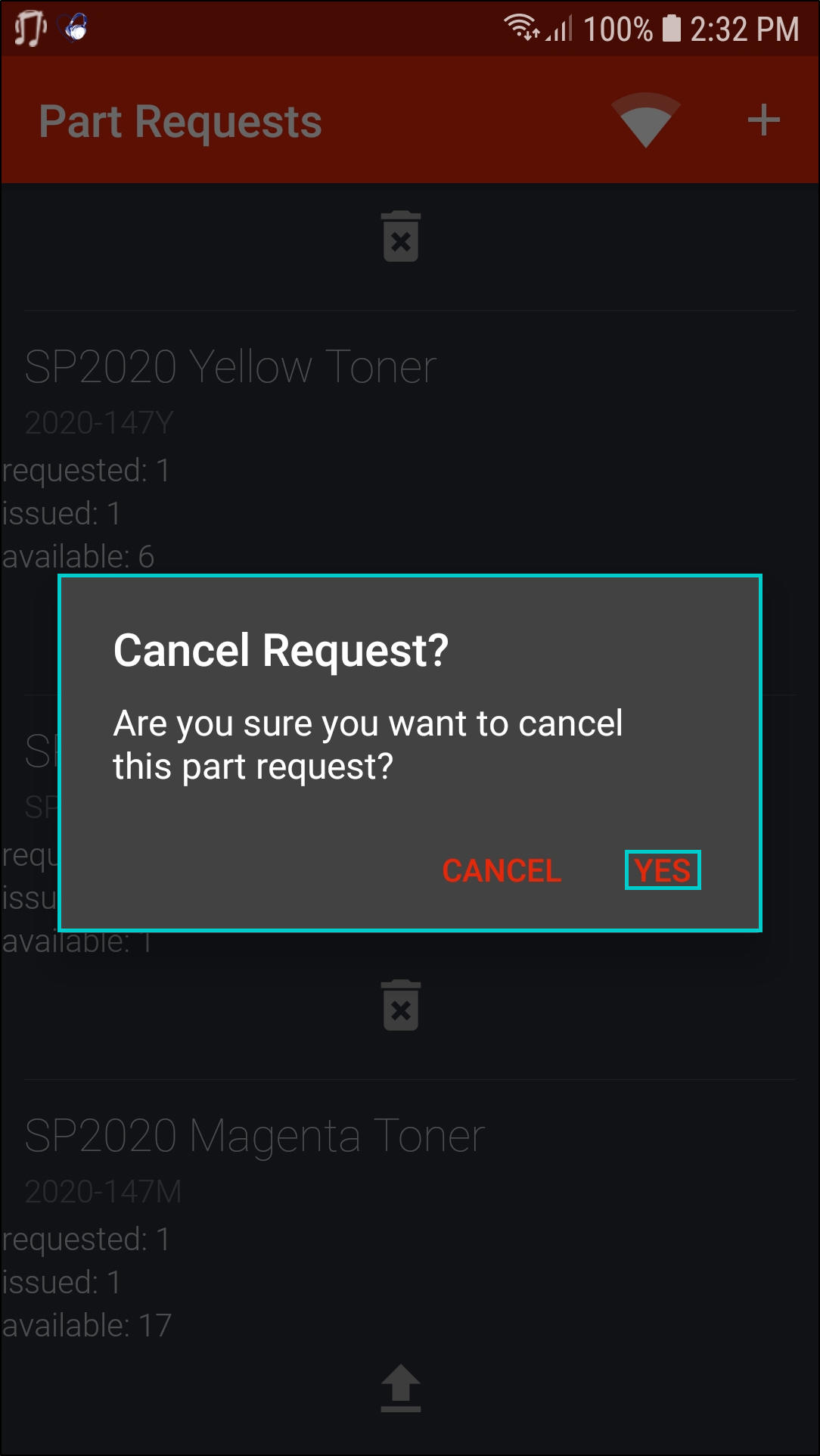- Are you sure you want to cancel this part request?