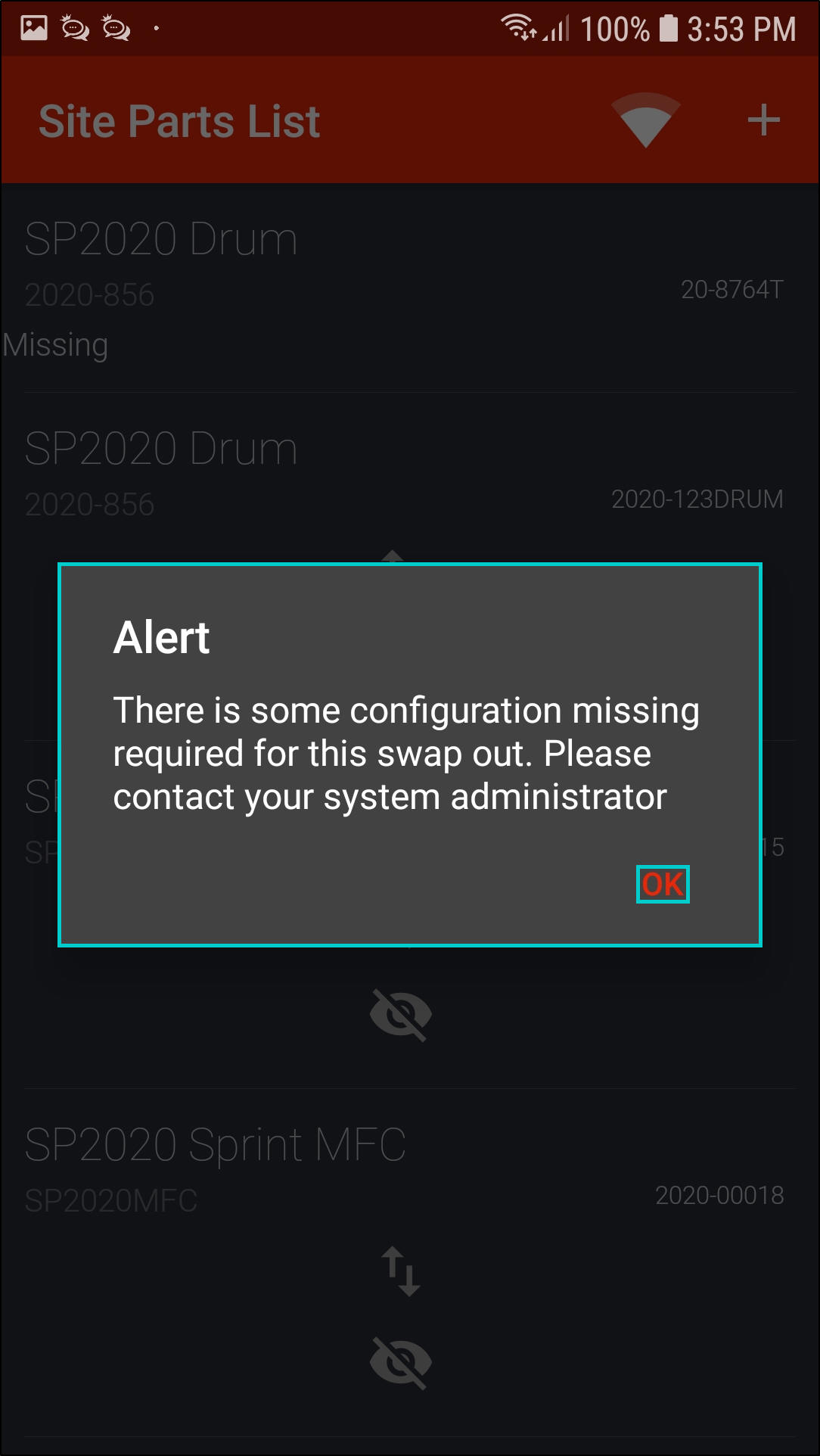 - Note: If you try to swap out an item that is not linked to a contract, an Alert message in the Site Parts List screen will pop up telling you;