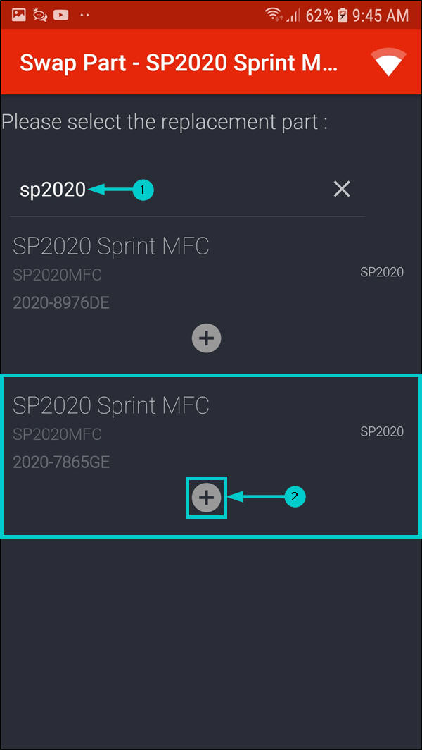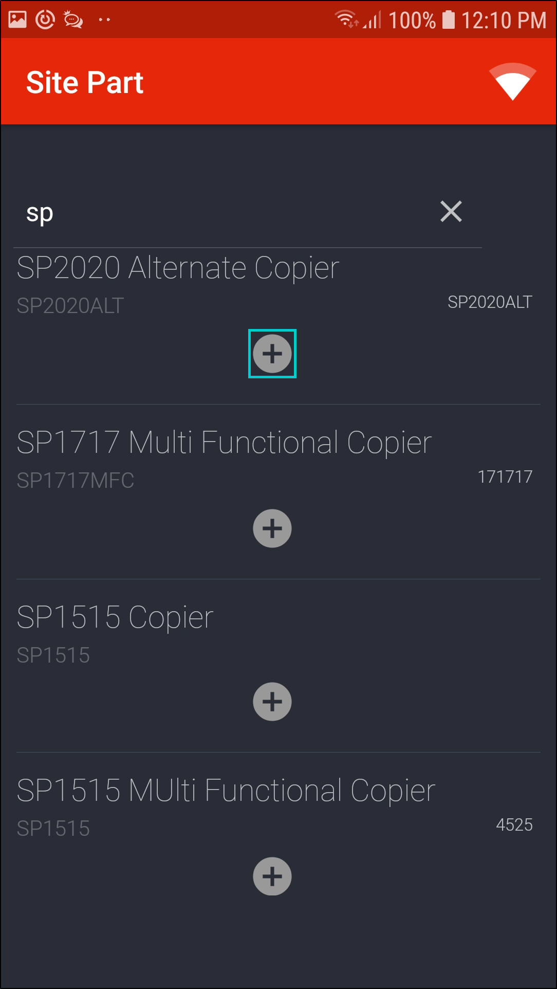 - Click on the '+' icon on the part code you wish to add.