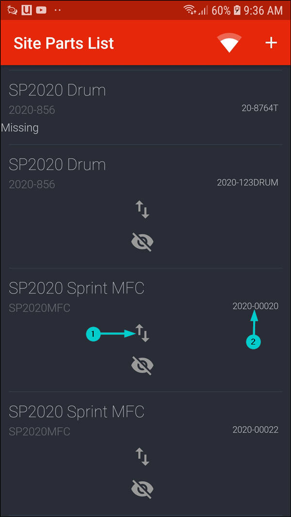 - In this image, serial number 2020-00020 is no longer displayed in the Site Parts List screen.