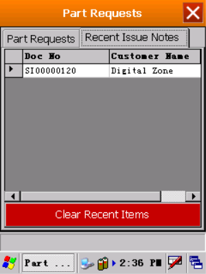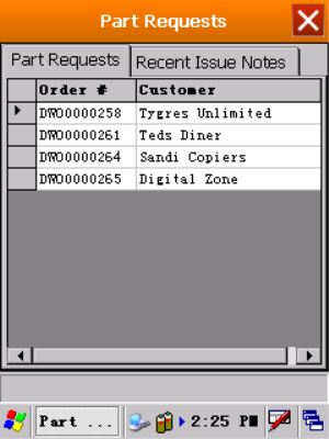 - 'Part Requests' tab: displays all Part Requests against which a Stock Issue needs to be done, with the Work Order Code / Invoice Number and Customer. (Note that if the work order is not linked to a customer, this field will be blank).
