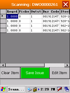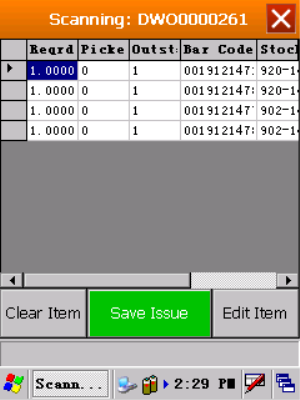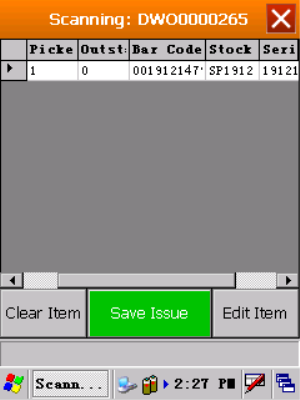 - You can partially issue C-Class Items. In this example you will notice the Picked and Outstanding quantity columns displaying what has been scanned and what is still outstanding. (Any items not issued will remain on the part request list, and can be issued later).