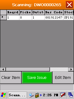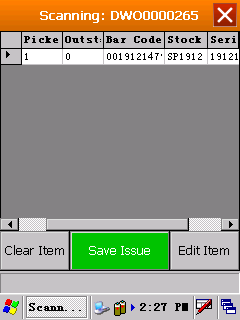 - You can partially issue C-Class Items. In this example you will notice the Picked and Outstanding quantity columns displaying what has been scanned and what is still outstanding. (Any items not issued will remain on the part request list, and can be issued later).